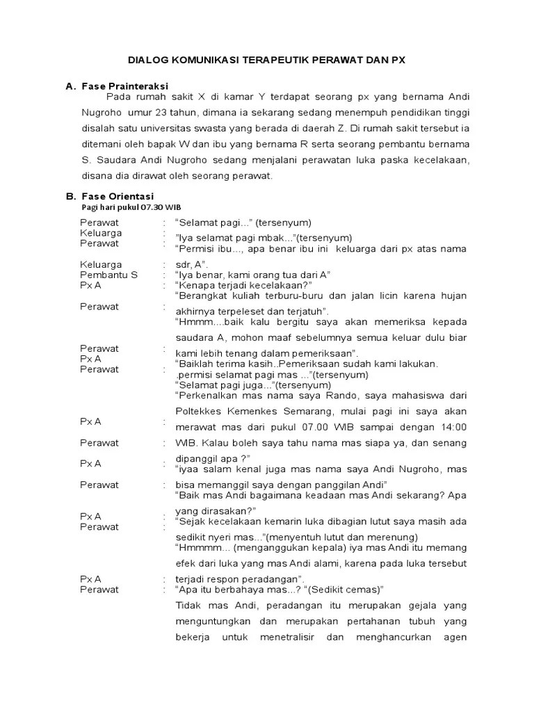 Contoh drama aplikasi komunikasi terapeutik pada pasien lansia1. Siapkan rencana percakapan yang akan anda lakukan pada saat berinteraksi dengan pasien. Keterampilan komunikasi terapeutik, dapat meliputi : Perawat membuka wawancara dengan memperkenalkan diri . Dialog komunikasi pada pasien dengan gangguan jiwa by dennyekaa in types > presentations and.